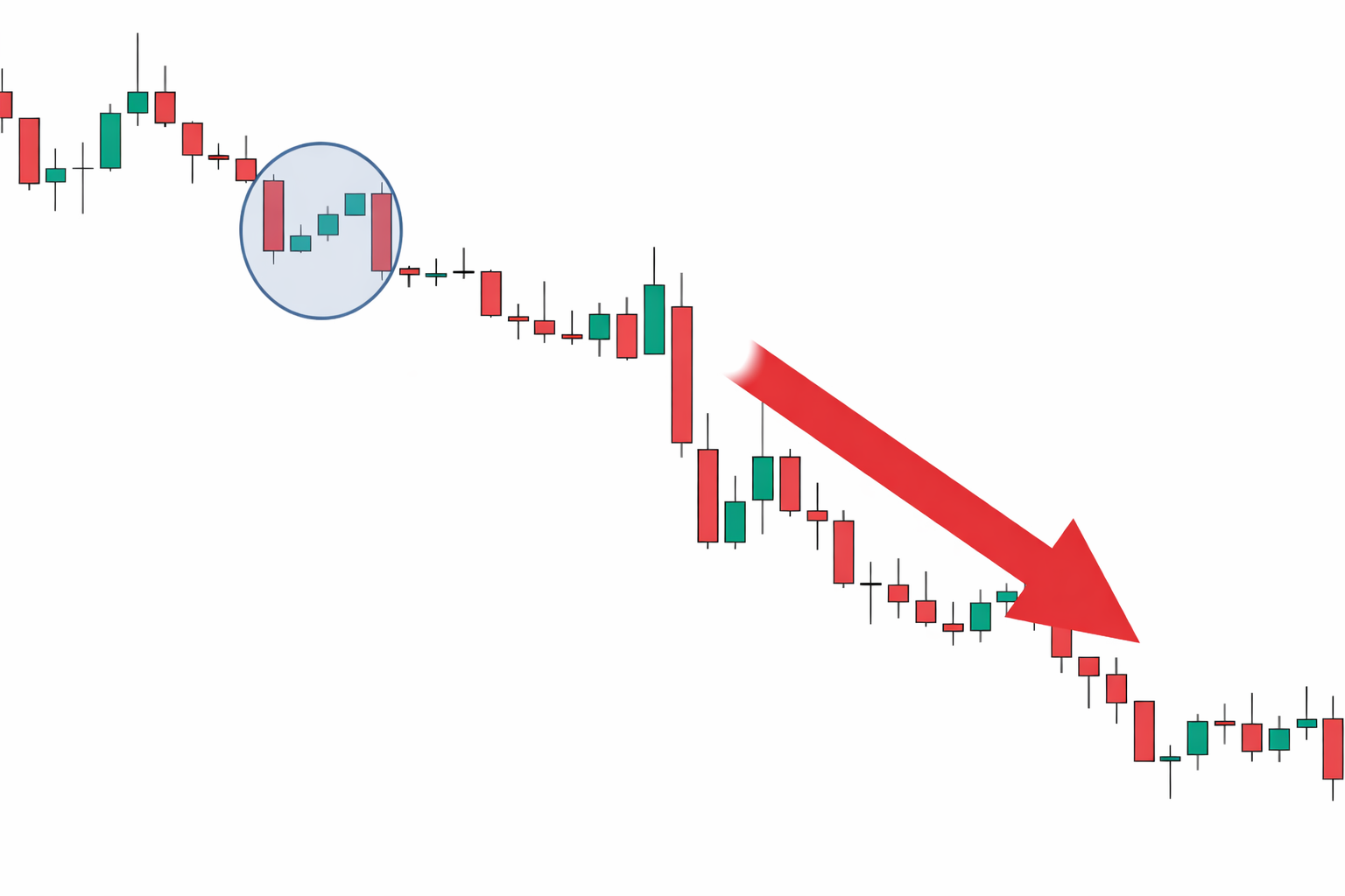 実体が長い大陰線のローソク足に続いて、3本の小さなローソク足が出現した。