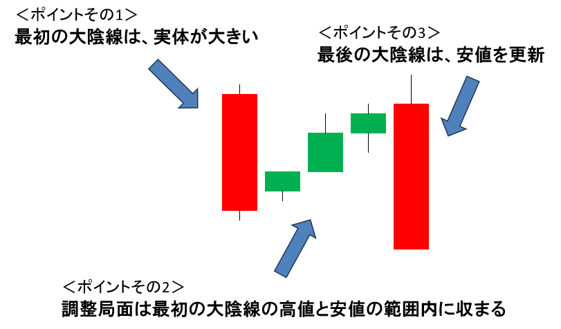 | ポイント | ・最初の大陽線は実体が大きい ・3本の陰線は1本目の範囲内 ・最後の大陽線は高値更新 |
