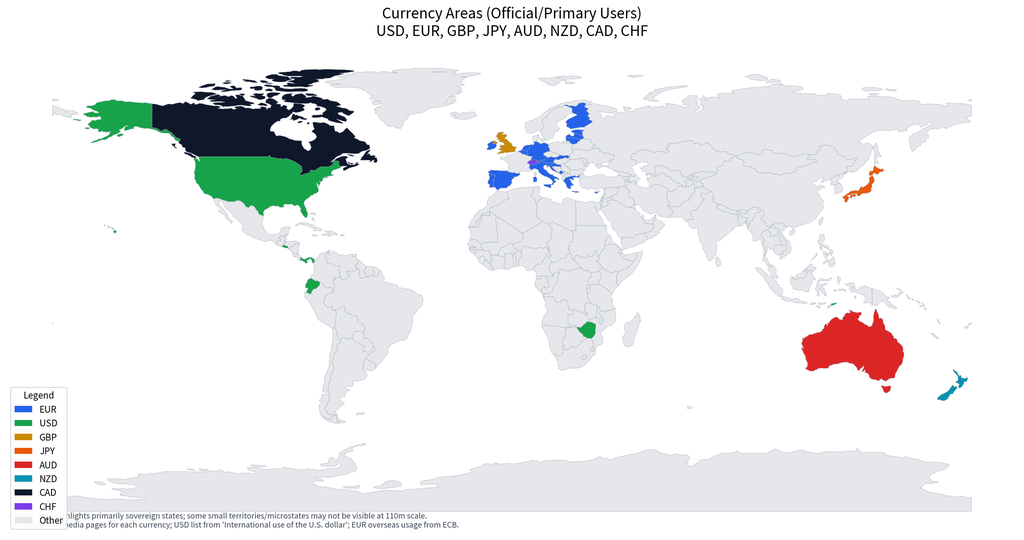 FXで主に取引される通貨ペアに登場する通貨を通貨圏ごとにまとめると、こんな感じなんですよね。